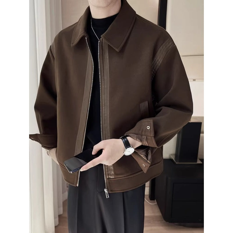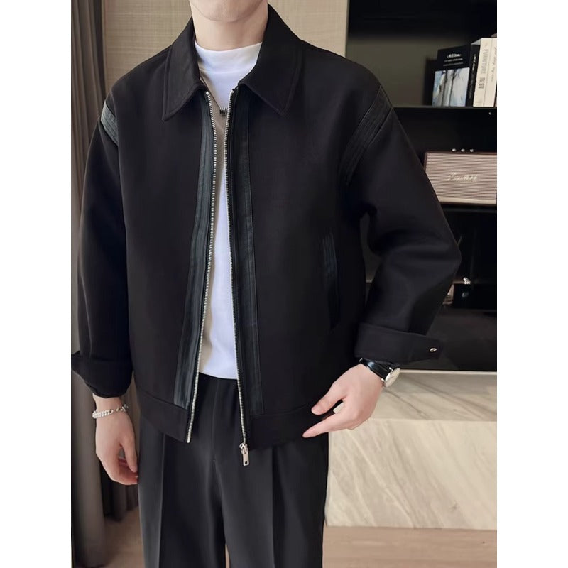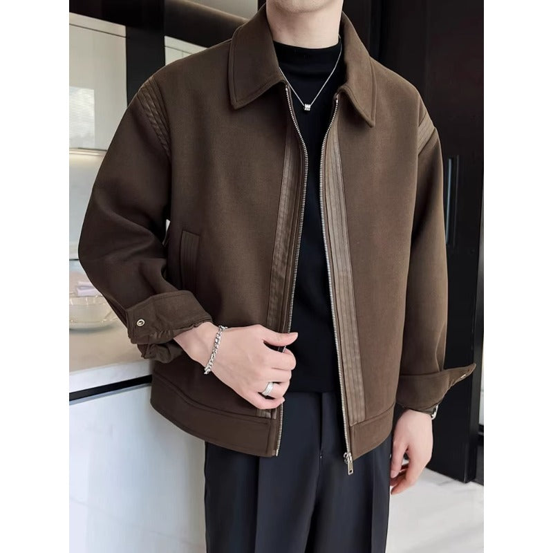 Casual Wool And Leather Patchwork Warm And Thick Woolen Autumn And Winter Lapel Jacket